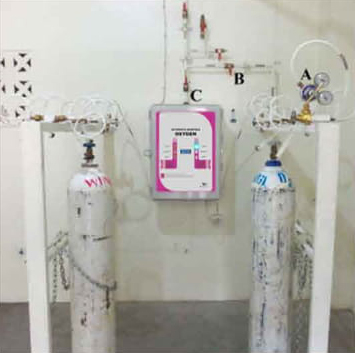 - Lampu LED sebagai indikator tekanan gas dengan keterangan : IN USE (sedang dipakai), STAND BY (cadangan), dan EMPTY (kosong)